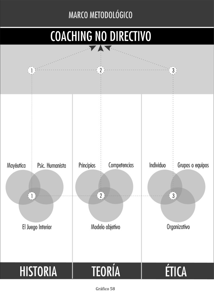 La esencia no directiva representada en el marco histórico está integrada en el marco teórico del coaching (punto 2 del gráfico 58). En dicho marco, distinguimos tres elementos fundamentales que aportan coherencia teórica al proceso. Estos son: los principios del coaching (descritos y desarrollados en la segunda parte del libro), las competencias o habilidades del coach, y un modelo objetivo como abstracción imprescindible para realizar sesiones y evaluar, supervisar y mejorar las técnicas o herramientas utilizadas durante los proceso de coaching.